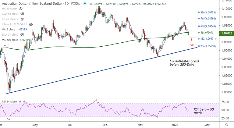 Summary: AUD/NZD is consolidating break below 200-DMA. The pair has paused a 5-day bearish streak after the Australian dollar was buoyed on upbeat Q4 CPI data. Bias is tilted towards the downside. But, retrace above 200-DMA will negate any further bearish bias.