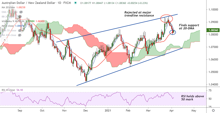 The pair trades in an rising Wedge pattern and bounce off 20-DMA has raised scope for upside resumption.