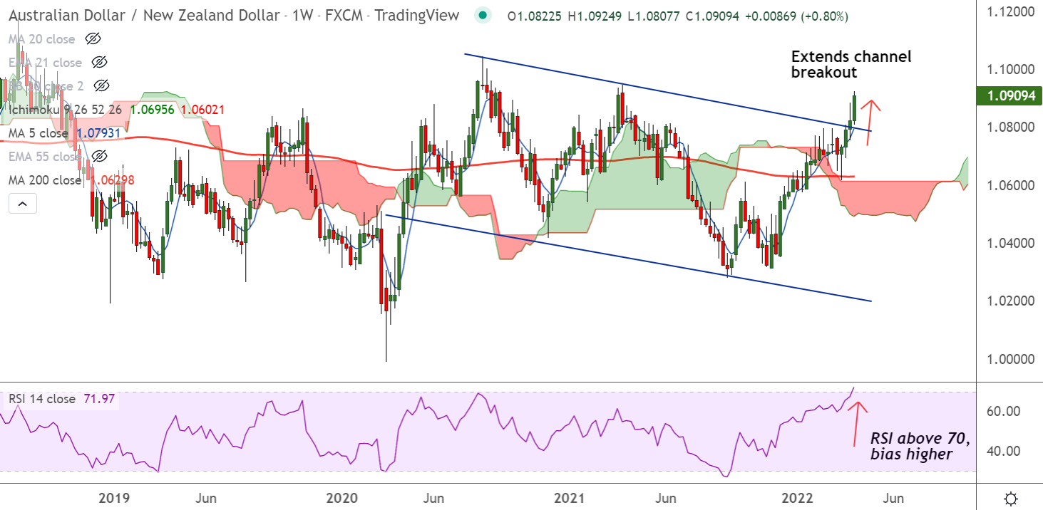 Summary: AUD/NZD technical outlook remains bullish. Channel breakout raises scope for further gains. Price action is hovering around 110-month EMA, watchout for break above for upside continuation.