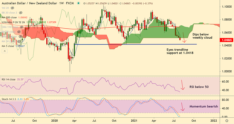 Summary: AUD/NZD trades with a strong bearish bias, further downside on cards. Scope for test of trendline support at 1.0420.