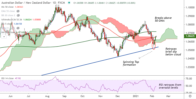The pair hovers around 50-DMA, retrace above daily cloud keeps scope for upside.