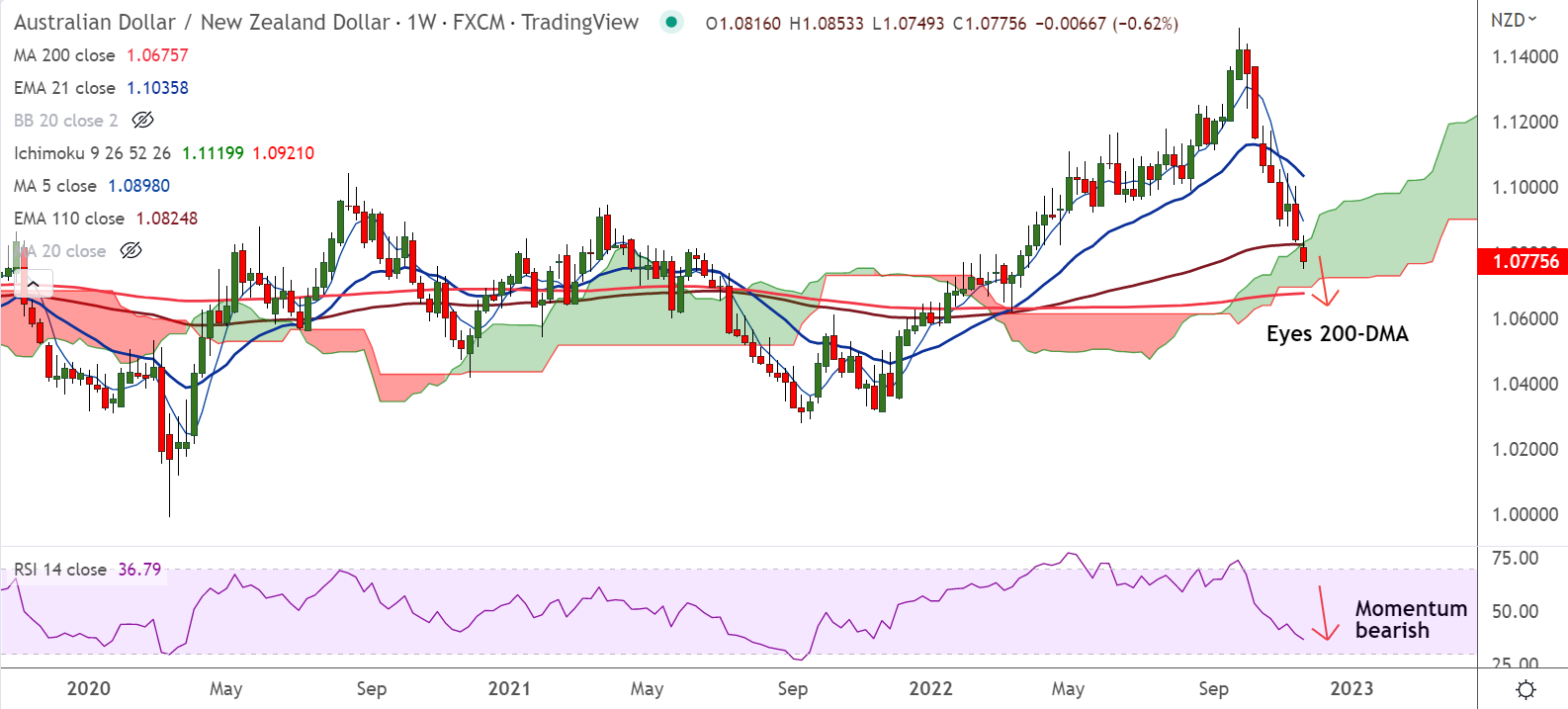 AUD/NZD is on track to test 200-week MA at 1.0675. Bearish invalidation only above 200-DMA.