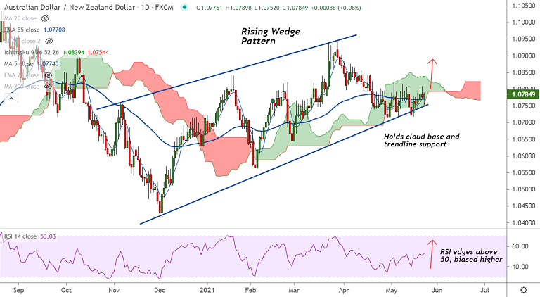 Summary: AUD/NZD holds above 200-DMA. Watchout for break above daily cloud for further gains. Focus on RBNZ monetary policy meet (due Wednesday) for cues.