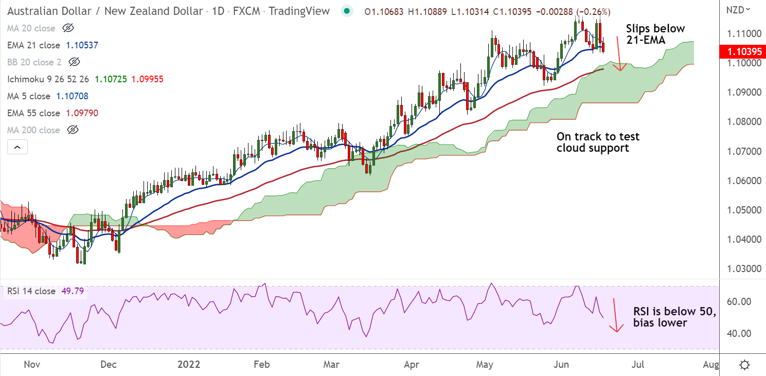 - The pair has slipped below 21-EMA and is on track to test daily cloud