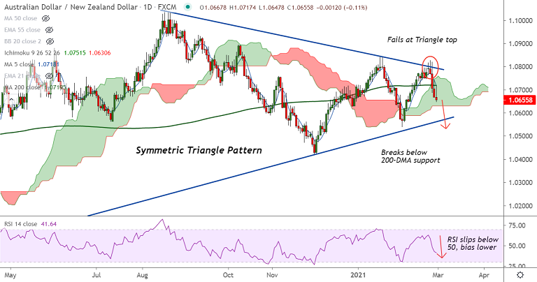 AUD/NZD on a downward spiral after rejection at Triangle top, slips below 200-DMA.