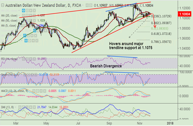 - AUD/NZD struggles to break major trendline support at 1.1075, bias neutral.