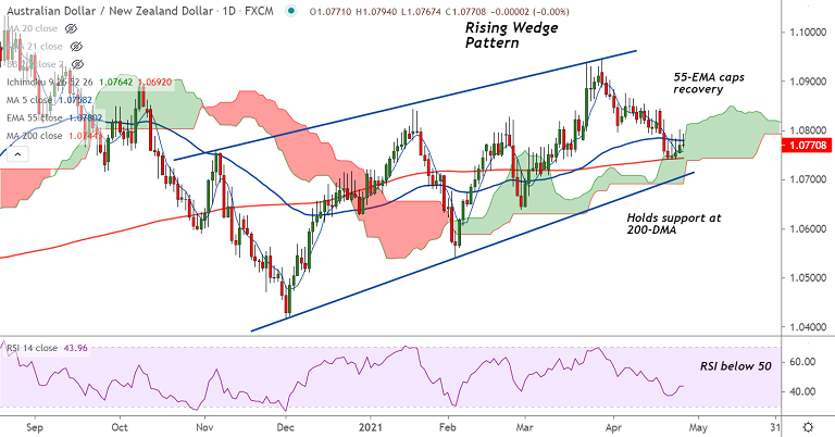 Weakness likely only on breach at 200-DMA support. On the flipside, decisive break above 21-EMA will fuel upside in the pair.