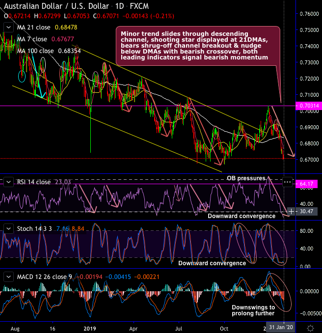 Trade tips: On trading perspective, at spot reference: 0.67 levels, contemplating above technical rationale, it is advisable to execute tunnel options strategy with upper strikes at 0.6721 and lower strikes at 0.6668 levels, thereby, one can fetch certain yields as long as the underlying spot FX keeps dipping but remain above lower strikes on the expiration.