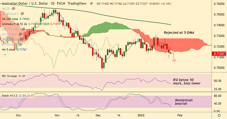 AUD/USD was trading 0.15% lower on the day at 0.7132 at around 05:00 GMT, bias is bearish.