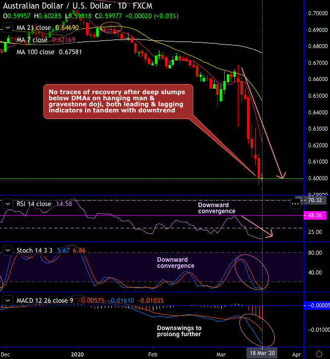 AUDUSD short-term trend: It retains downside momentum, 0.5960 vulnerable today. The pair shows no traces of recovery at this juncture after deep slumps below DMAs upon hanging man and gravestone doji pattern candles, while both leading and lagging indicators are in tandem with prevailing downtrend.