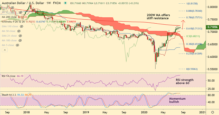 Summary: The pair trades with a bullish momentum. 200W MA is major resistance at 0.7252. Decisive break above required for upside continuation.