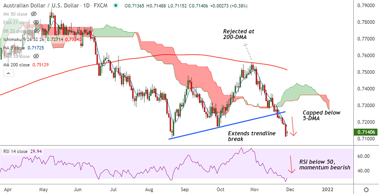 Major Support Levels: 0.7104 (Lower BB), 0.70 (Oct 2020 low), 0.6991 (Nov 2020 low)