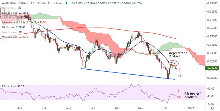Resistance levels - 0.7134 (5-DMA), 0.7166 (21-EMA), 0.7181 (200-week MA)