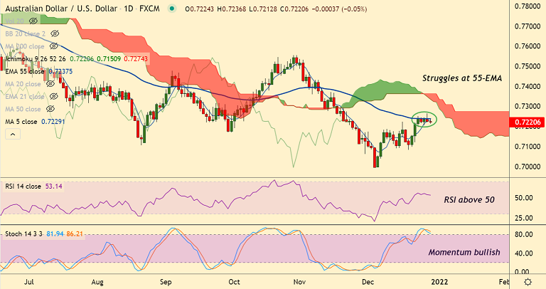 Summary: AUD/USD trades with a bullish bias. Watch out for decisive break above 55-EMA for further upside. Bullish invalidation likely on retrace below 200-week MA.