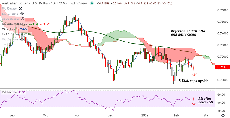 Resistance levels - 0.7128 (20-DMA), 0.7155 (200-week MA), 0.7176 (55-EMA)