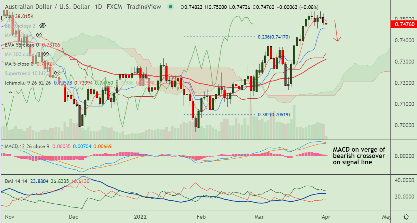 Summary: AUD/USD is poised for some weakness. Dip till 21-EMA at 0.74 likely. Bullish invalidation only below 200-DMA.