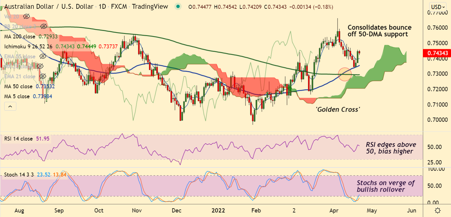Summary: AUD/USD poised for further upside. 20-DMA is immediate resistance at 0.7464. Watch out for break above for upside continuation.