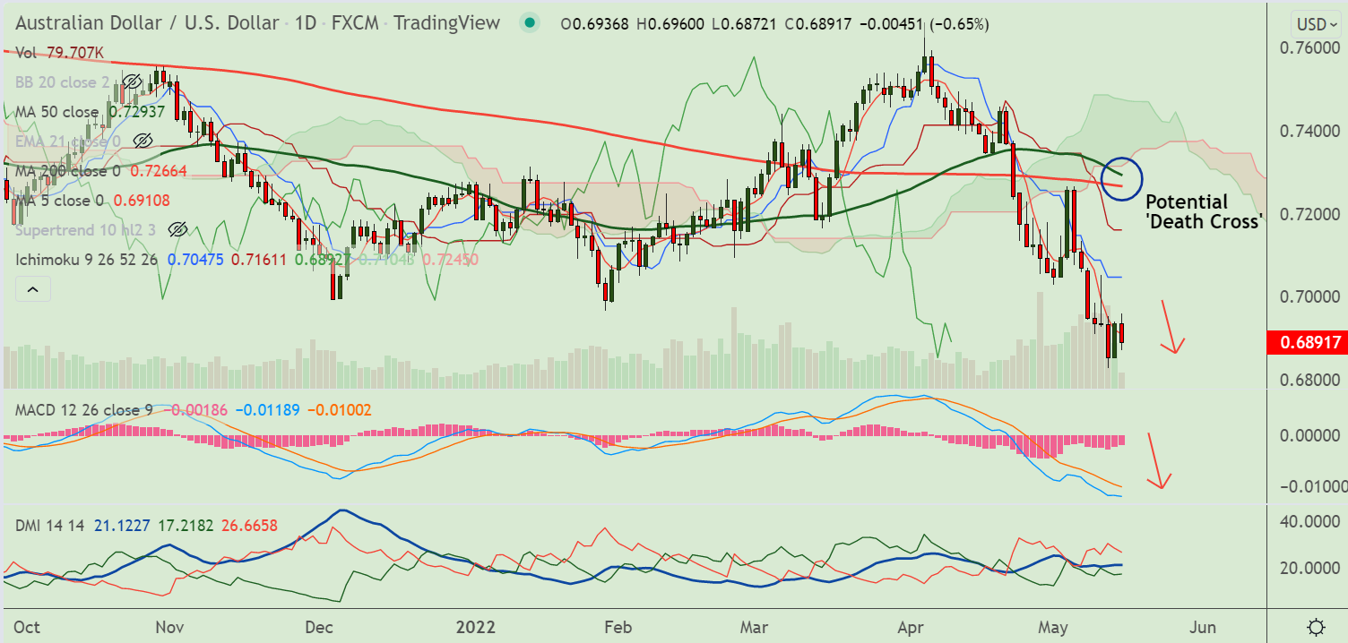 AUD/USD was trading 0.75% lower on the day at 0.6885 at around 05:30 GMT, outlook bearish.