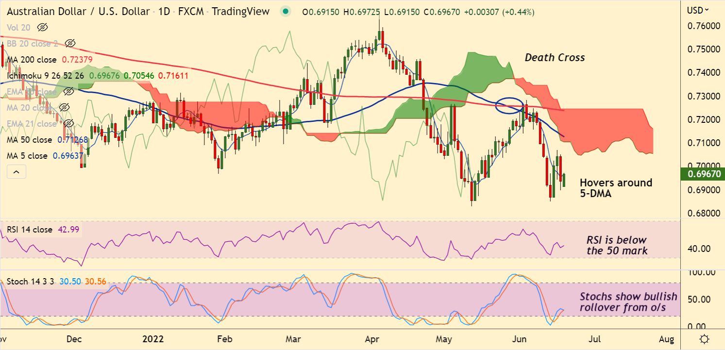 AUD/USD was trading 0.41% higher on the day at 0.6965 at around 04:45 GMT, outlook still bearish.