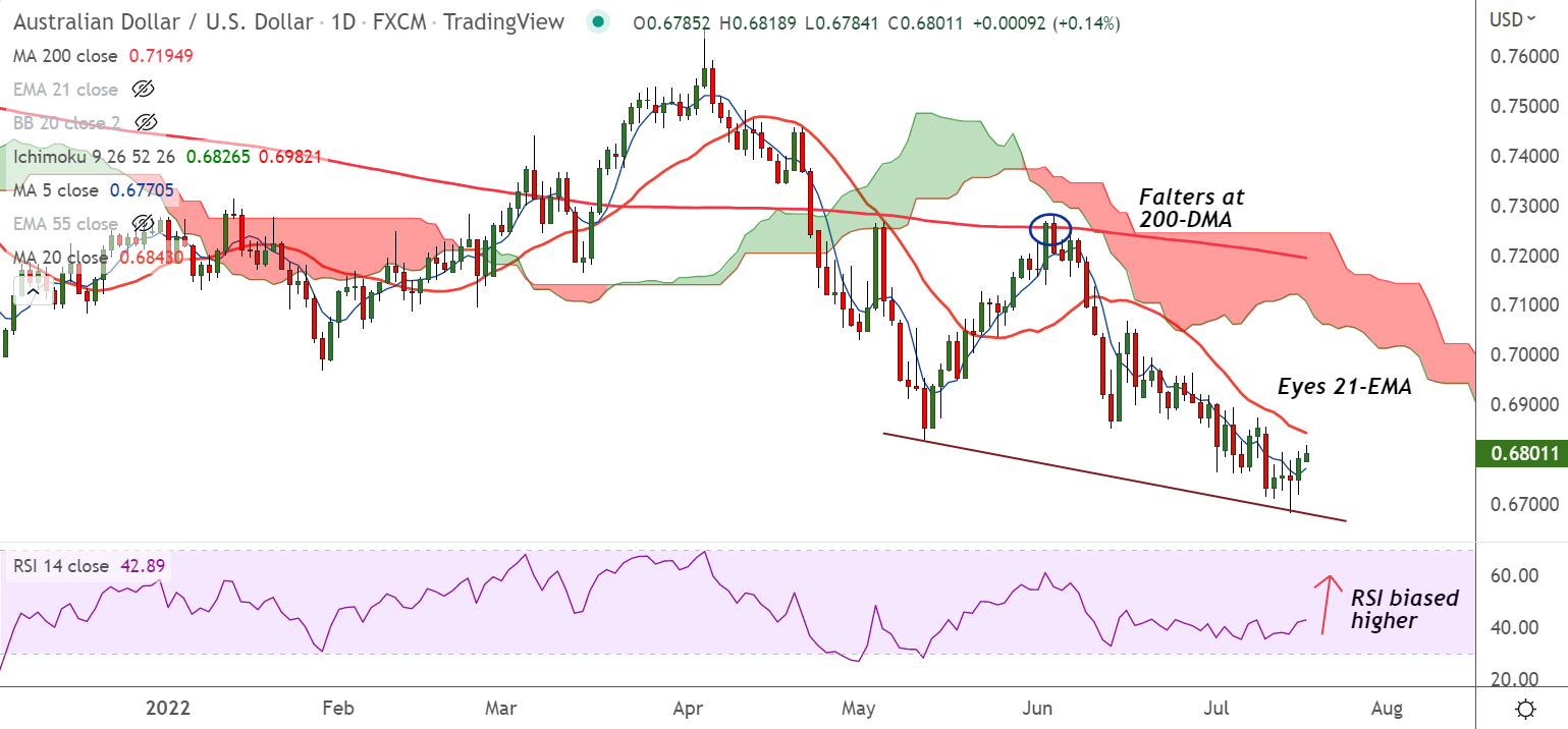AUD/USD was trading 0.15% higher on the day at 0.6801 at around 04:25 GMT. The pair picks up bids amid easing fears of hawkish Fed rate hikes. Further, China’s readiness for more stimulus which triggered optimism in the markets favor buyers in the pair.