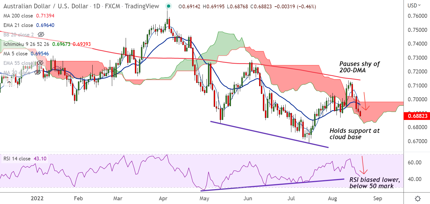 - The pair has shown a decisive break below 50-DMA and is testing cloud base support