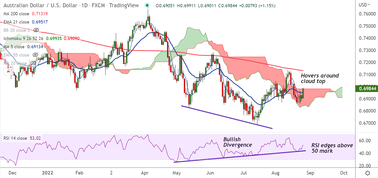 Summary: AUD/USD poised for further upside. Watch out for break above daily cloud for further gains.