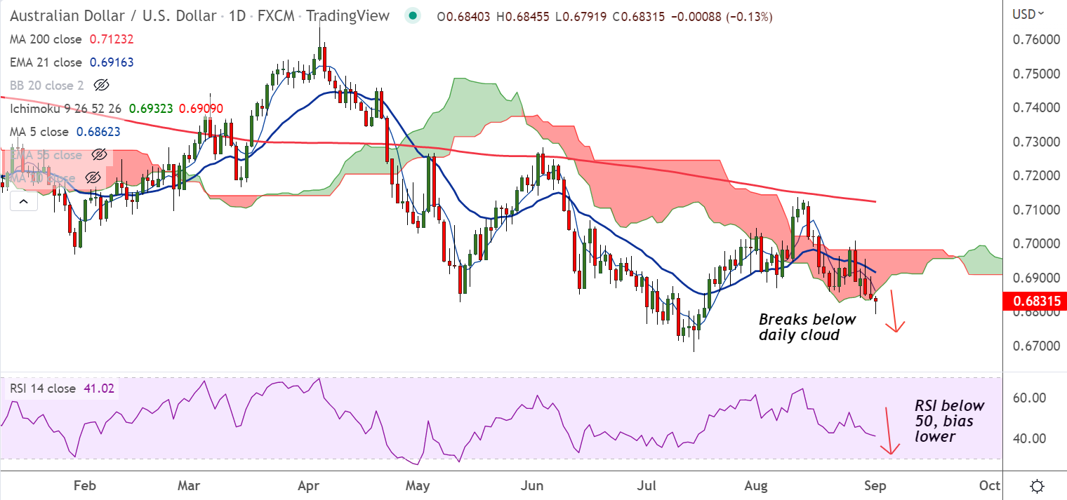 AUD/USD was trading 0.31% lower on the day at 0.6818 at around 05:30 GMT