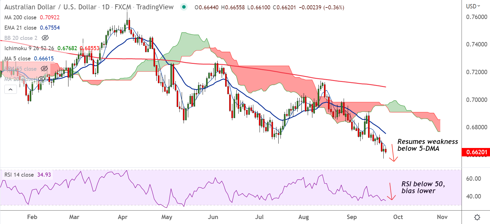 Summary: AUD/USD was trading with a bearish bias. Focus on US PMI data for further impetus. Scope for test of fresh multi-month lows.