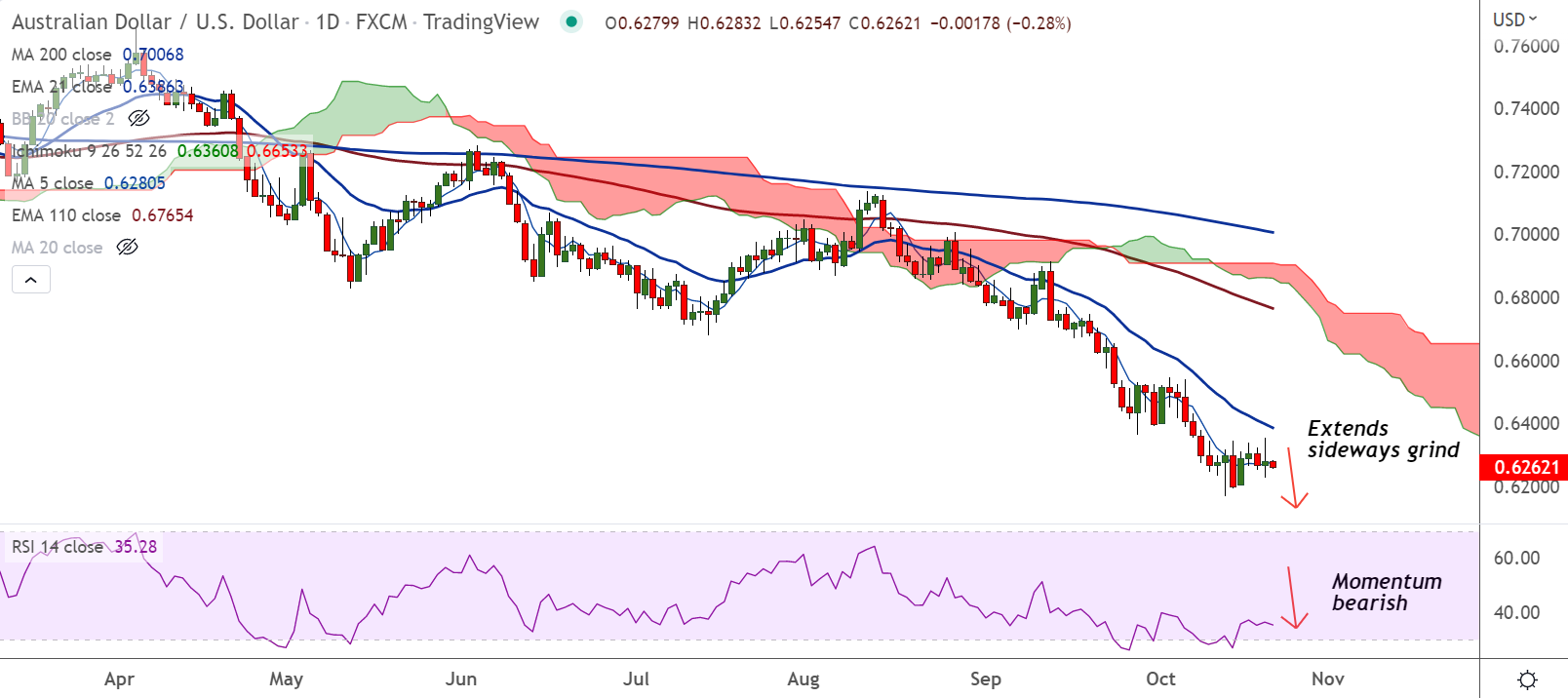 AUD/USD extends sideways grind as the risk-off impulse has rebounded across markets. The Australian dollar remains largely depressed after maintenance of a status quo by the People’s Bank of China (PBOC) and the downbeat Aussie employment data.