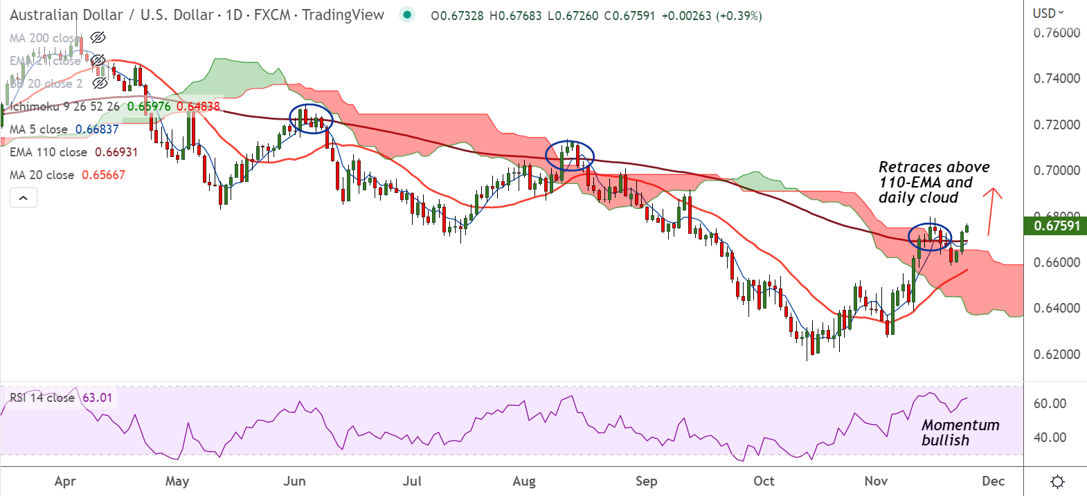 Summary: AUD/USD trades with a bullish bias. The pair is on track to extend gains above 0.68 handle. 200-DMA at 0.6935 in sight.