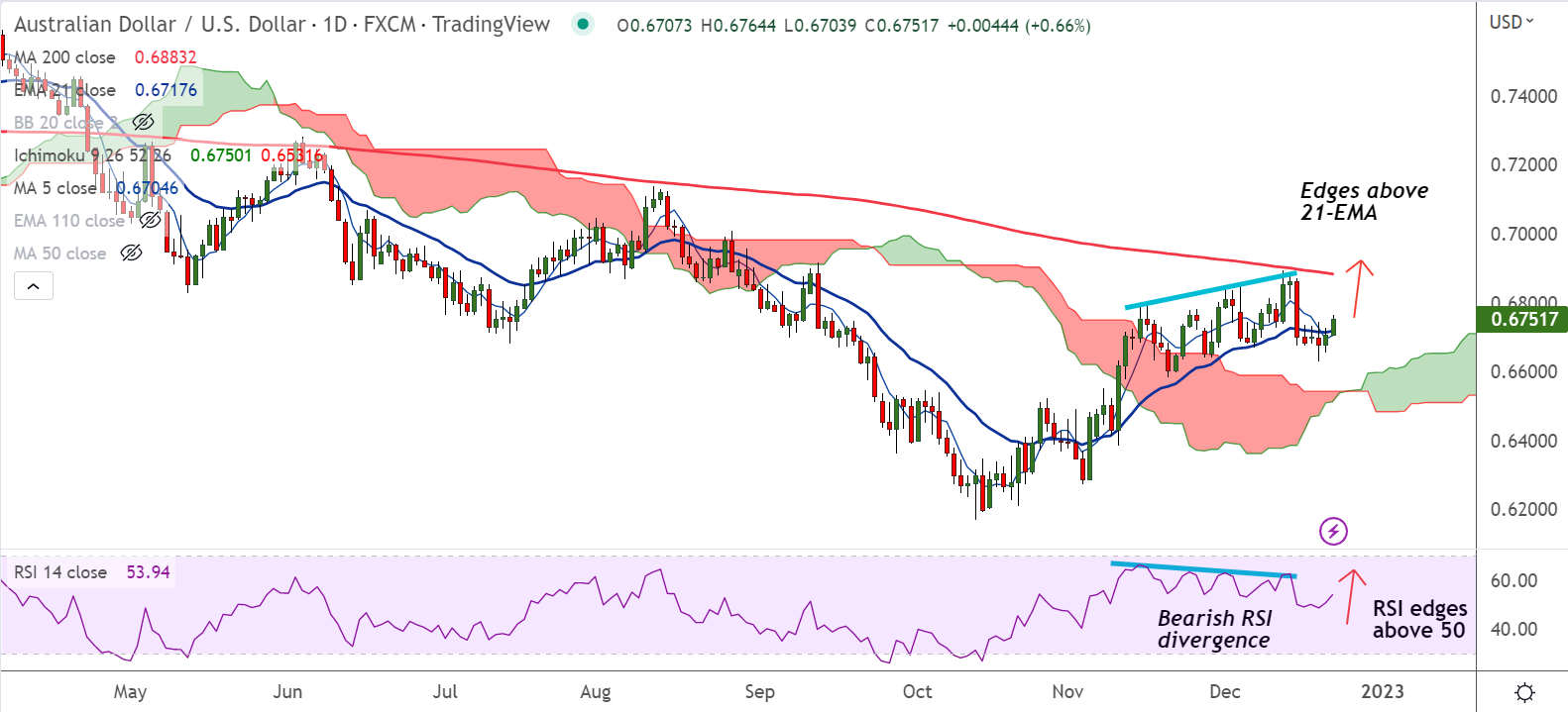 Summary: AUD/USD poised to extend gains. Close above 21-EMA will confirm further gains.