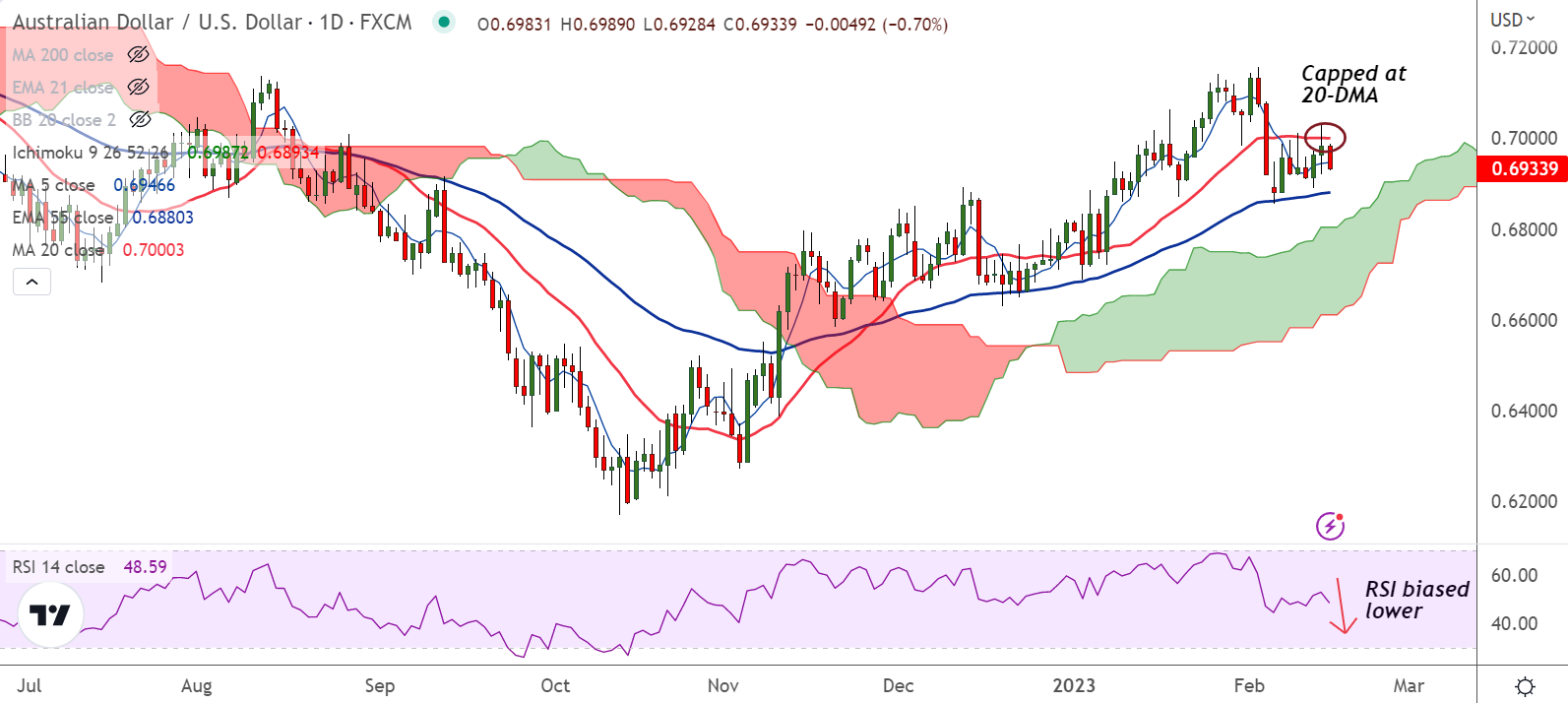 Summary: AUD/USD trades with a bearish technical bias. Price action remains capped between 20-DMA and 55-EMA. Break out of range will provide clear direction.