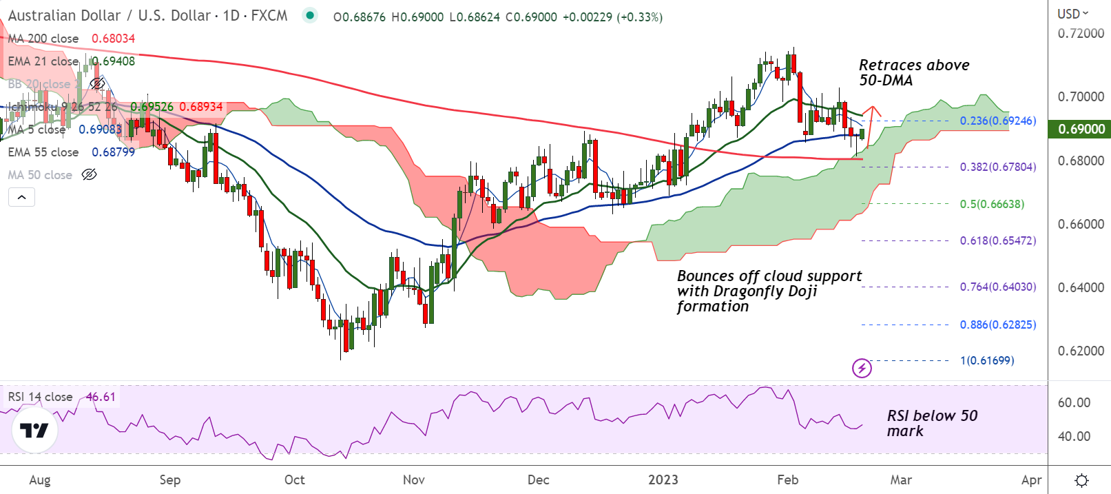 Summary: AUD/USD finds strong support at 200-DMA and daily cloud, any weakness only on break below. Watch out for break above 21-EMA for more gains.