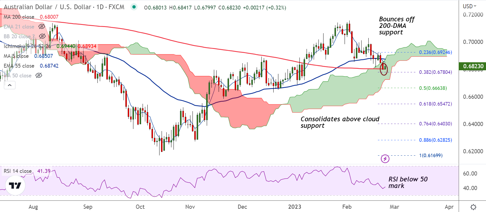 Major Support Levels: 0.6800 (200-DMA), 0.6763 (Lower BB)
