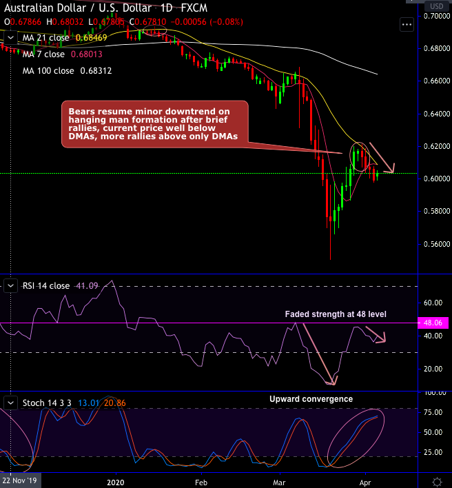 AUDUSD short-term trend: The pair has formed hanging man pattern at peaks of rallies at 0.6168 levels (refer daily chart). Consequently, bears resume the minor downtrend upon this bearish formation after brief rallies, the current price is well below DMAs, more rallies above DMAs.