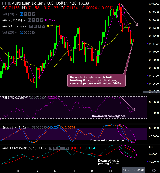 In AUDUSD minor trend, a resembling bearish engulfing pattern has occurred at 0.7136 levels, consequently, the bears have plummeted prices below DMAs (refer 2H plotting).
