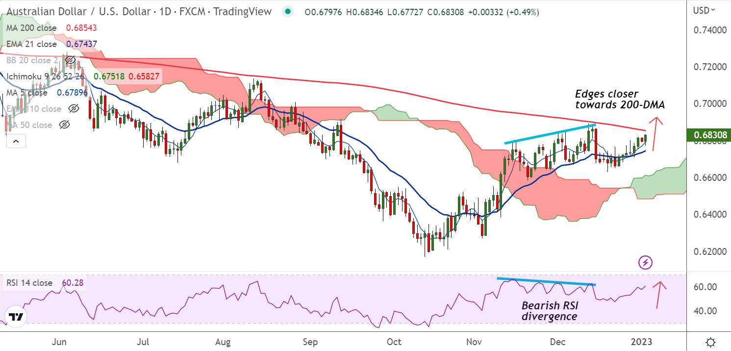 Summary: The pair is approaching 200-DMA which is major resistance at 0.6854, decisive break above required for upside continuation.
