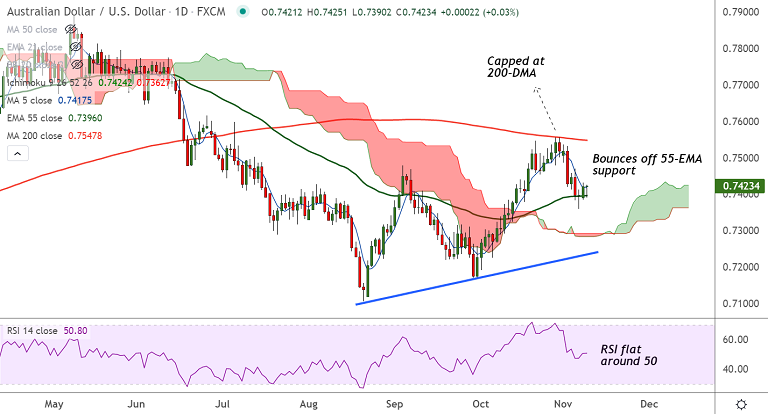Summary: AUD/USD has bounced off 55-EMA with Doji on Friday's trade. Breakout above 21-EMA will see more upside.