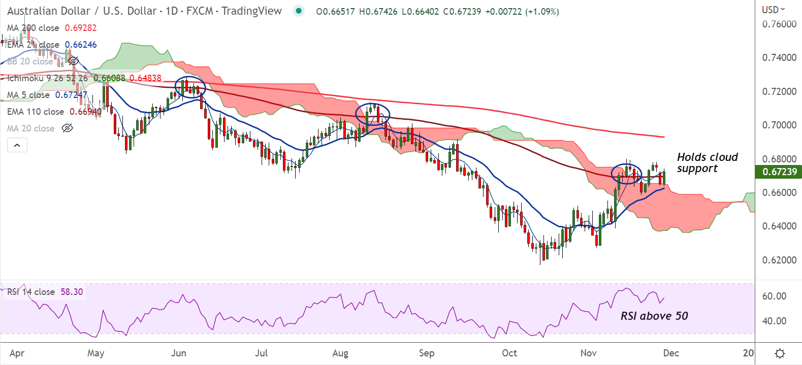 AUD/USD has erased previous session's losses. The major has bounced off daily cloud support and has reclaimed 0.67 handle.