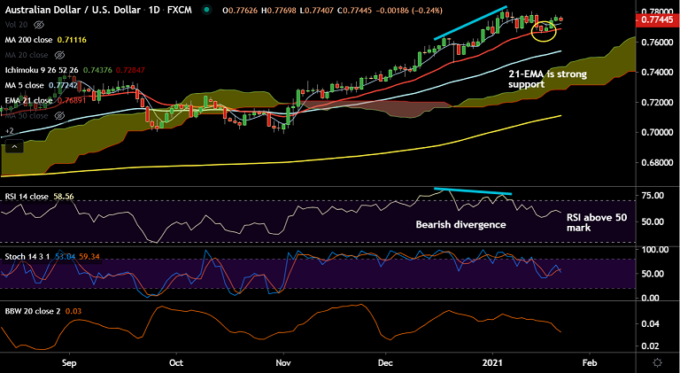 AUD/USD was trading 0.25% lower on the day at 0.7743 at around 03:40 GMT, pauses 3-day winning streak.