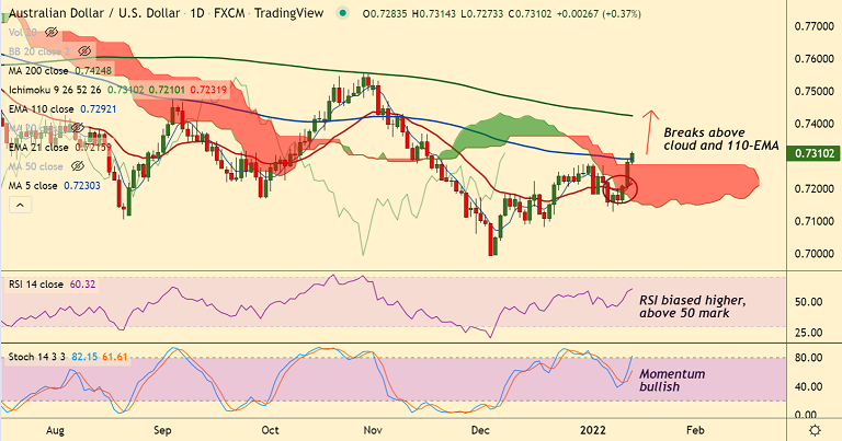 Summary: AUD/USD technical bias has turned bullish after break above daily cloud and 110-EMA. Next immediate bull target lies at 0.7370 ahead of 200-DMA at 0.7424.