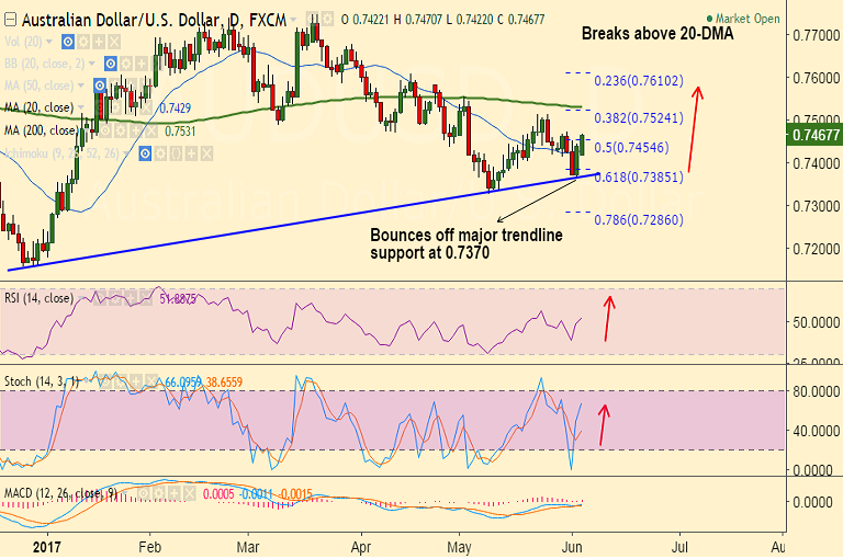 - AUD/USD has bounced of major trendline support at 0.7370 levels.