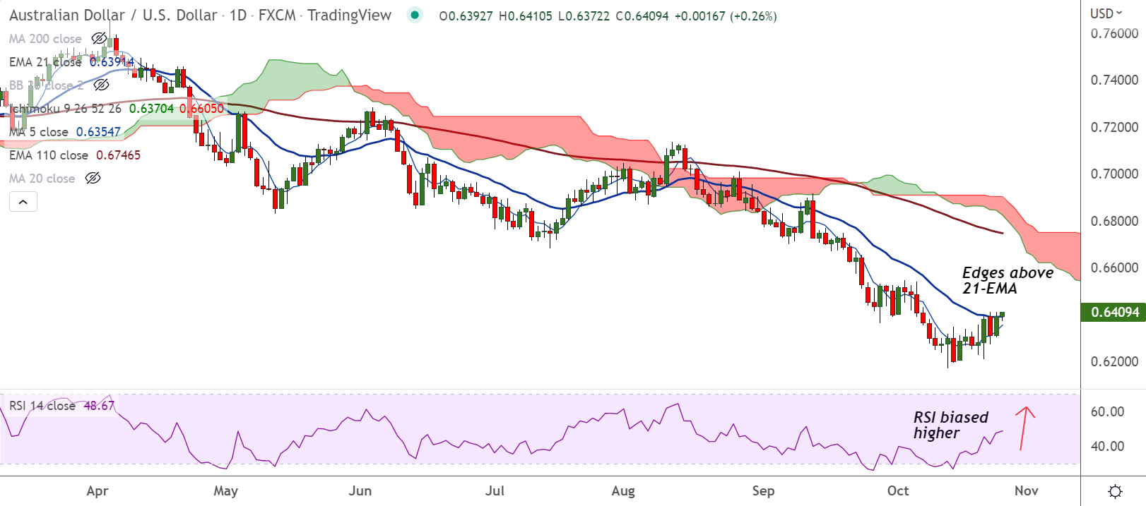 AUD/USD was trading 0.26% higher on the day at 0.6409 at around 04:35 GMT. The pair has edged above 21-EMA raising scope for further upside.