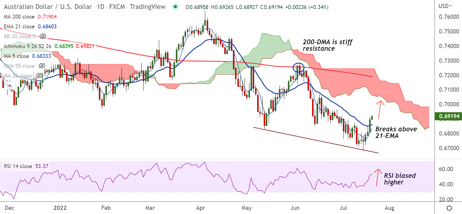- AUD/USD breaks above 21-EMA, hits highest for July till date