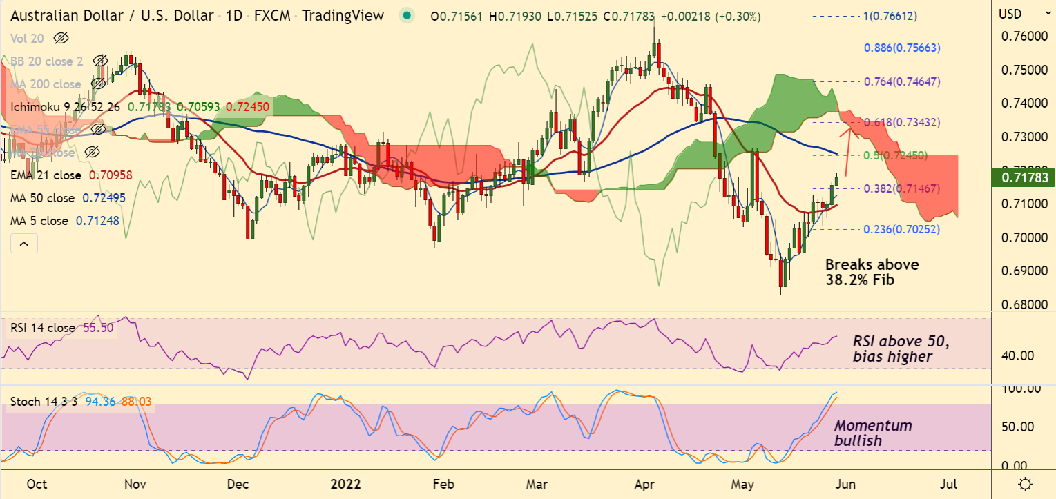 Summary: AUD/USD trades with a bullish technical bias. The pair is on track for further gains. Next major bull target lies at 50% Fib at 0.7245.