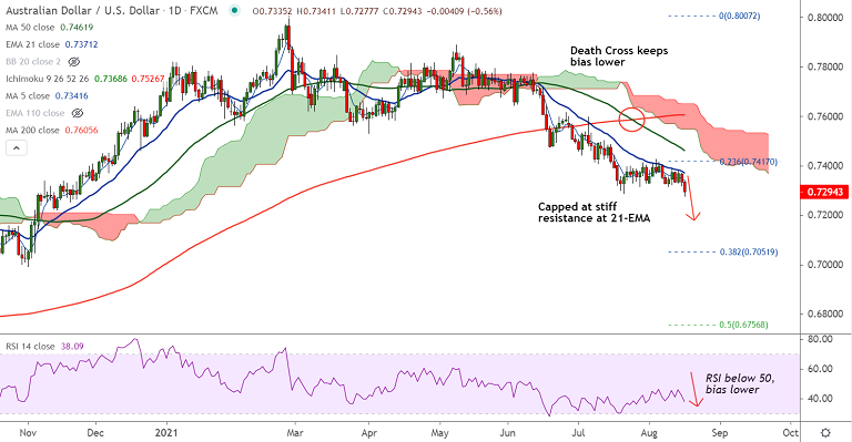 Summary: AUD/USD has resumed downside after rejection at 21-EMA. Scope for test of 200-week MA at 0.7222.