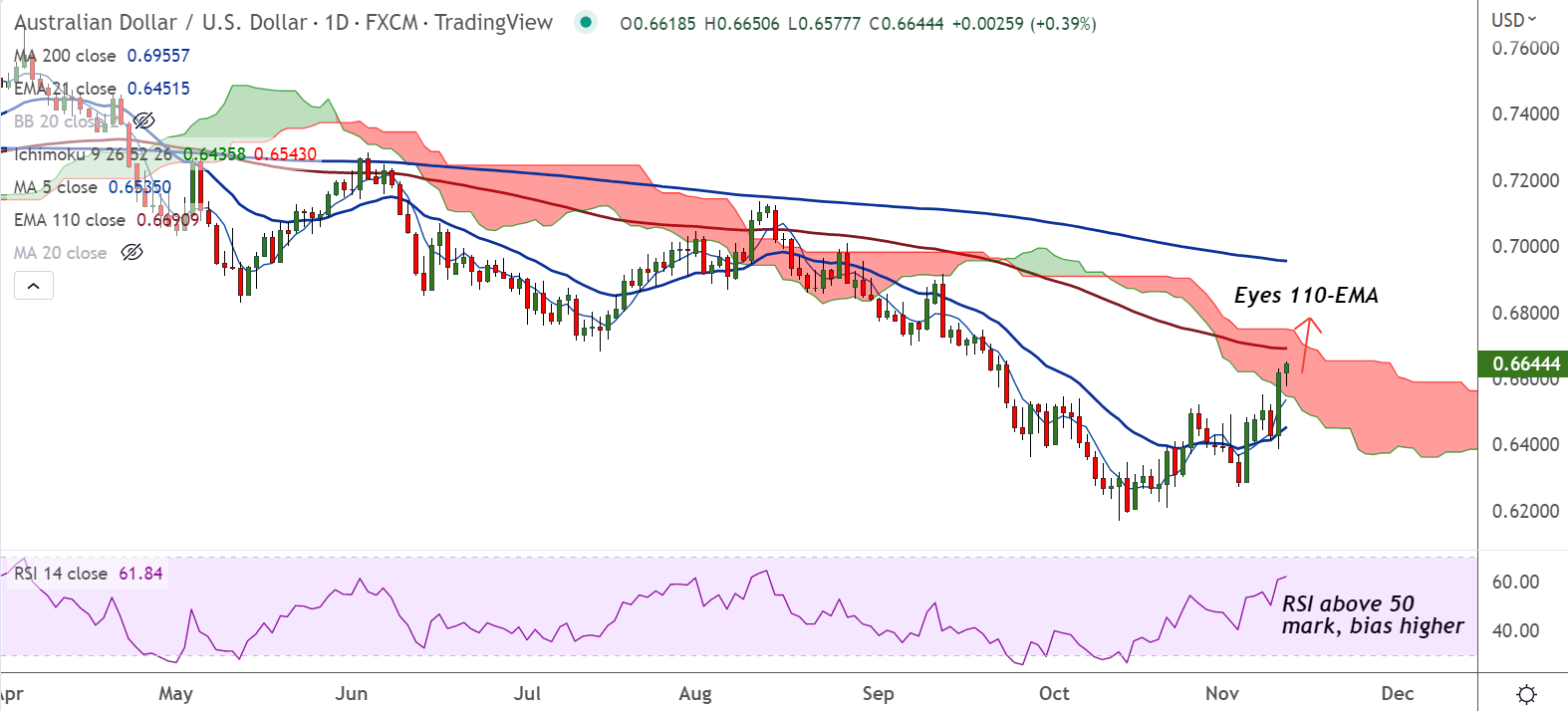 Summary: AUD/USD trades with a bullish bias. 110-EMA is immediate resistance at 0.6642. Break out of daily cloud will fuel further gains.
