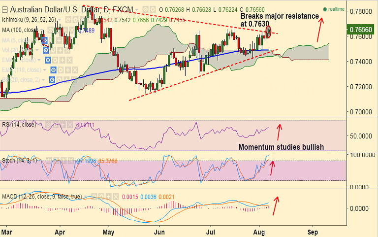 Recommendation: Good to go long on dips around 0.7630, SL: 0.7580, TP: 0.7675/ 0.77/ 0.7720
