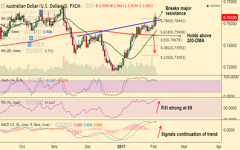 Recommendation: Good to go long on dips around 0.7640, SL: 0.76, TP: 0.7695/ 0.7730