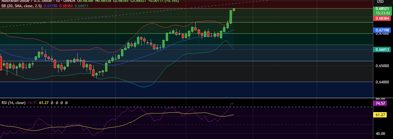 • Immediate resistance is located at 0.6856(23.6%fib), any close above will push the pair towards 0.6900(Psychological level).